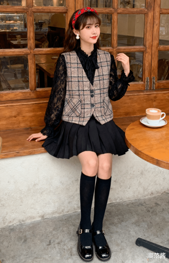浅杏色短款收腰针织马甲,内搭浅粉色 V 领针织裙,马甲领口比裙子高 1cm,形成层次。脚踩米色小皮鞋,戴同色系贝雷帽,针织材质柔软显温柔,收腰设计突出曲线,灯光下显皮肤白,约会超加分。