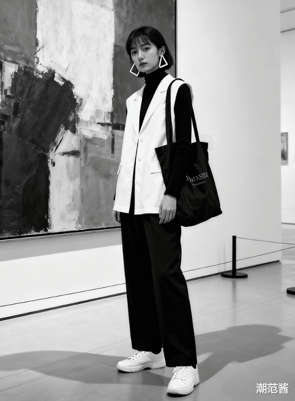 黑色短款棒球领马甲,内搭白色连帽卫衣,卫衣下摆留 1/3 自然垂落,不全塞进裤子,更显慵懒。搭配浅蓝色直筒牛仔裤、白色运动鞋,戴一顶棒球帽,逛公园、喝咖啡都舒服,拍照时马甲的利落感中和卫衣的垮塌,显活力。